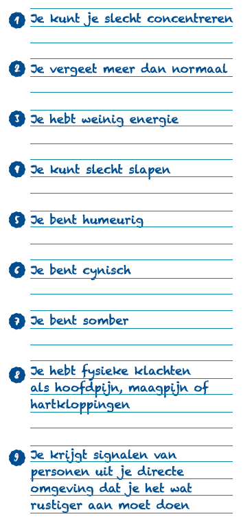 “Een burn-out houdt in dat iemand opgebrand is”, vertelt Marly. “De oorzaak daarvan is lang aanhoudende stress. Soms stress hebben, is normaal en heus niet gevaarlijk. Wanneer een stressvolle periode lang aanhoudt, kan het wél gevaarlijk worden. Concentreren wordt moeilijker, je hartslag stijgt en je krijgt hoofdpijn. Je raakt overspannen.”