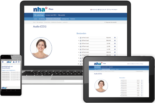 De lessen bevatten ook luister- en spreekoefeningen. Dat helpt je om de juiste uitspraak onder de knie te krijgen. De geluidsbestanden vind je digitaal terug in jouw online leeromgeving, Plaza. Je kunt deze geluidsbestanden afspelen op je computer, tablet of smartphone. Dat maakt een taal leren bij NHA nog makkelijker én leuker!