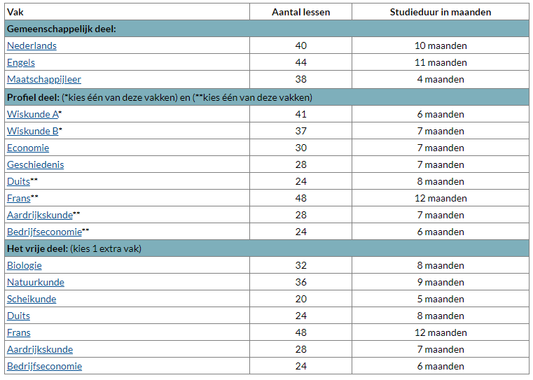 Het profiel Economie en Maatschappij bestaat uit de vakken: